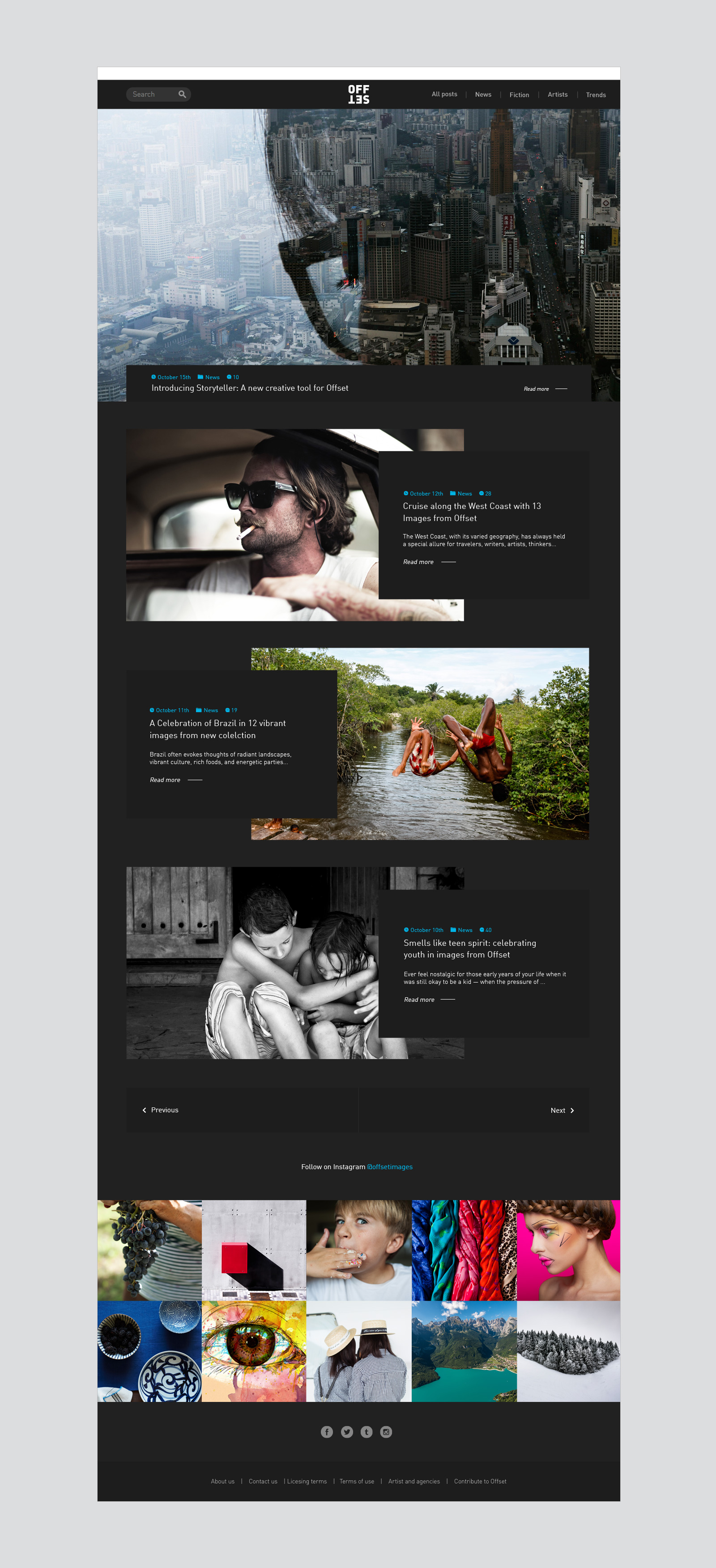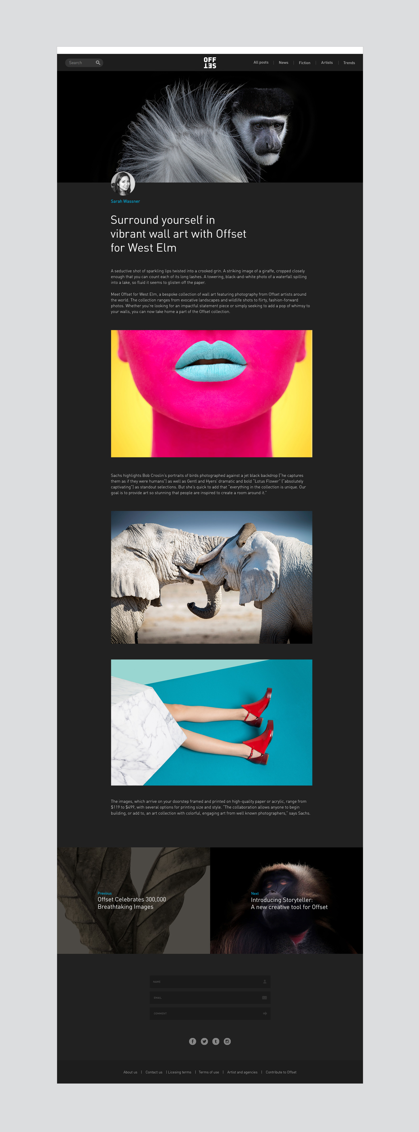 Offset is a high end brand of an exceptional mix of photography and illustration; both commercial and editorial imagery sourced from broad categories including fashion, beauty, lifestyle, landscape, food, and still life. It features top assignment photographers from around the world who shoot for major advertising clients and name brands. The project was adding a blog section to the site as well as curating and designing portfolio book featuring the best Offset images of 2015.